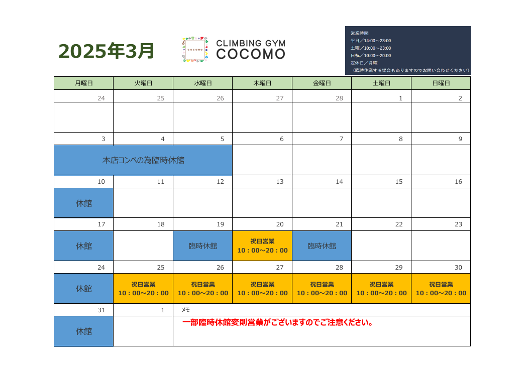 3月営業カレンダーについて