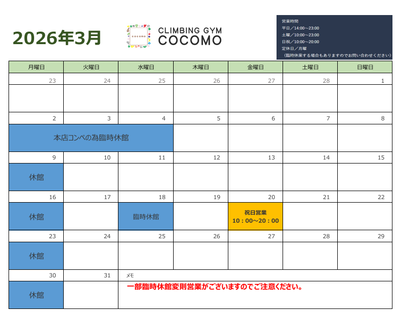 3月の営業カレンダーになります一部変則的な営業がございますので